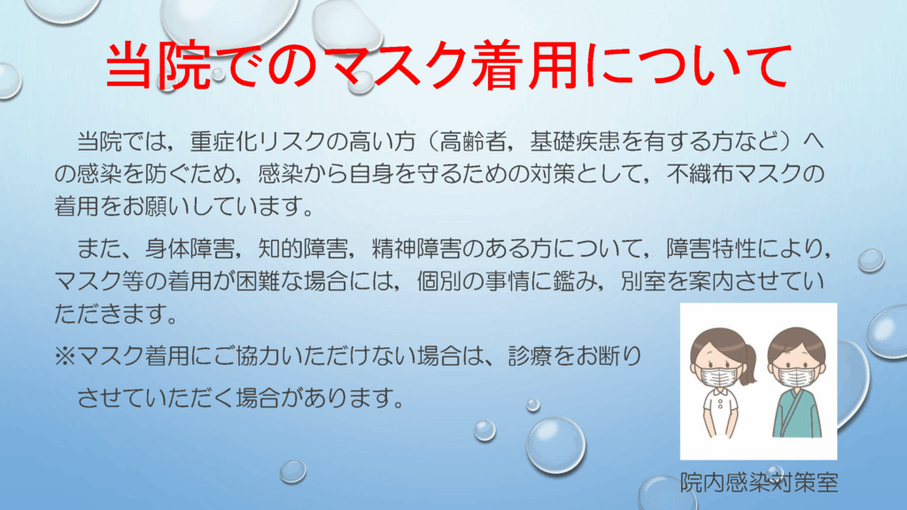 当院では、重症化リスクの高い方(高齢者,基礎疾患を有する方など)への感染を防ぐため、感染から自身を守るための対策として、来院されるすべての方に不織布マスクの着用をお願いしています。